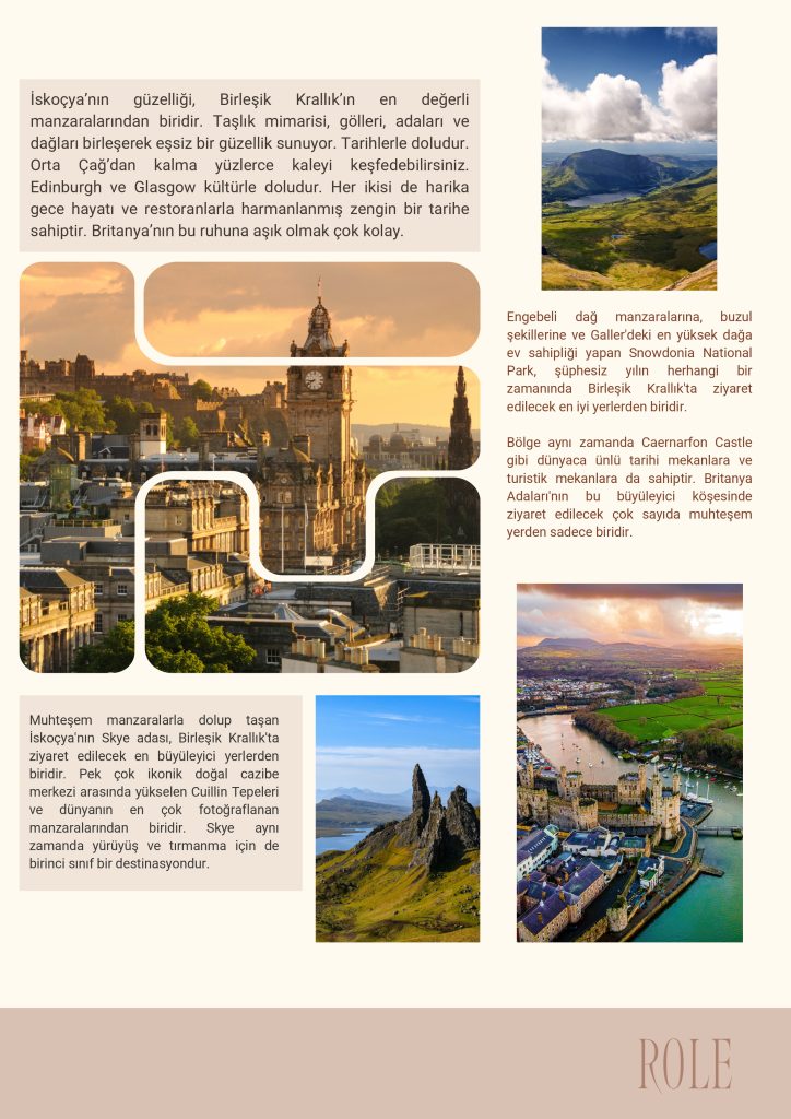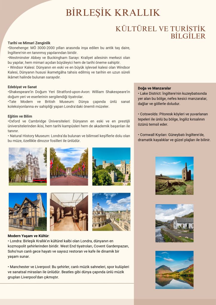 Birleşik Krallık (UK), İngiltere, İskoçya, Galler ve Kuzey İrlanda’dan oluşan bir adalar ülkesidir. İngilizce konuşulan bu ülke, hem tarihi hem de modern kültürü ile dünyada önemli bir yere sahiptir. Ülke, tarih boyunca büyük bir imparatorluk kurmuş ve dünya çapında önemli bir kültürel ve politik etki yaratmıştır. Londra, Birleşik Krallık’ın başkenti ve aynı zamanda en büyük şehri olup, küresel bir finans merkezi olarak öne çıkar. Birleşik Krallık’ın diğer önemli şehirleri arasında Edinburgh, Cardiff ve Belfast yer alır. Big Ben, Buckingham Sarayı, Tower of London ve British Museum gibi ikonik yapılar, Londra’nın çekim merkezleridir. İngiltere’nin diğer önemli şehirleri arasında Manchester, Liverpool, Birmingham ve tarihi üniversite şehirleri Oxford ve Cambridge yer alır.