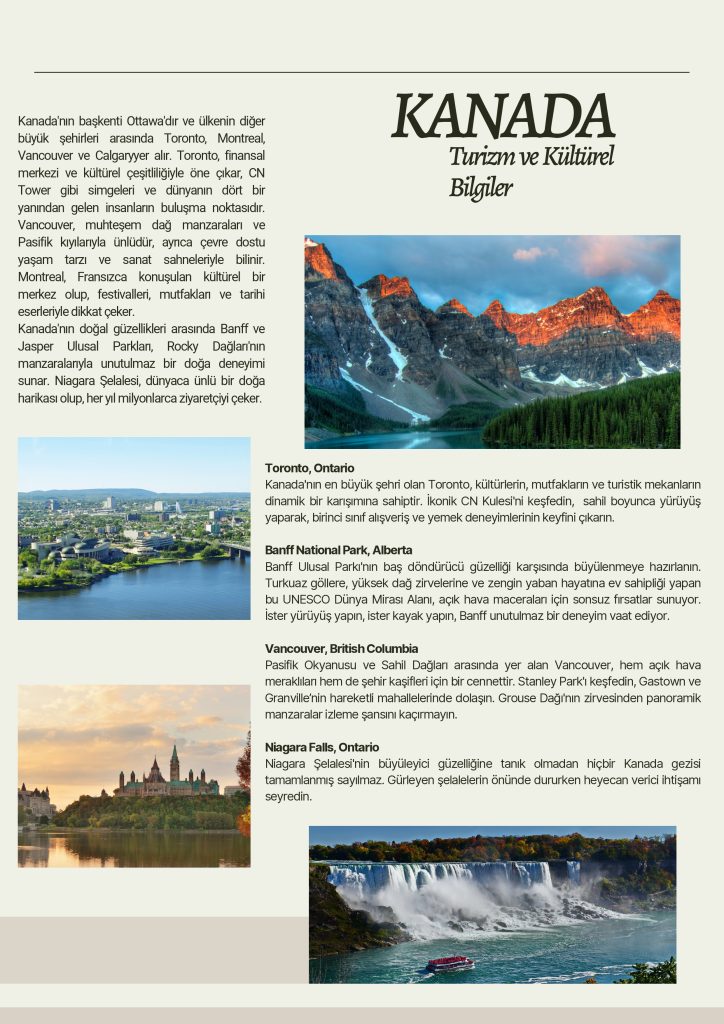 Kanada, Kuzey Amerika’nın en büyük ülkelerinden biri olup, doğal güzellikleri, zengin kültürel mirası ve modern şehirleriyle tanınır. Ülke, Atlantik Okyanusu’ndan Büyük Okyanus’a kadar uzanan geniş bir coğrafi alana sahiptir ve ABD ile sınırları bulunur. Kanada’nın kültürel yapısı, Avrupalı göçmenlerin yanı sıra son yıllarda Asya, Orta Doğu ve diğer bölgelerden gelen göçmenlerin etkisiyle de zenginleşmiştir.